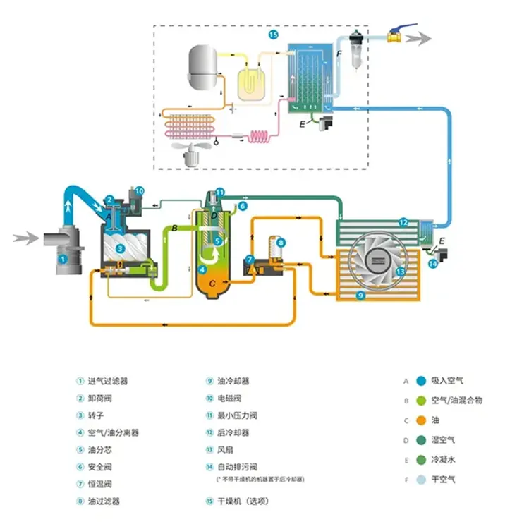 2. Pagalbinės sistemos: įskaitant tepalinės alyvos sistemą, aušinimo vandens sistemą, elektros valdymo sistemą ir kt., naudojamos normaliam oro kompresoriaus veikimui užtikrinti.