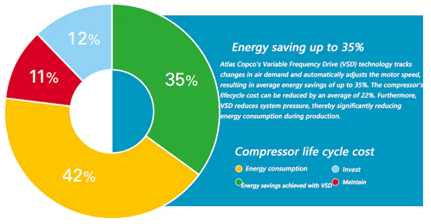 Energijos sąnaudos sudaro daugiau nei 80 % visų alyvos neturinčio sraigtinio oro kompresoriaus gyvavimo ciklo sąnaudų. Be to, suslėgto oro gamybai naudojama elektra sudaro daugiau nei 40 % visų gamyklos elektros sąnaudų. Siekdama sumažinti energijos sąnaudas, Atlas Copco sukūrė kintamo dažnio pavaros (VSD) technologiją suspausto oro pramonėje. VSD ne tik sutaupo daug energijos, bet ir saugo aplinką ateities kartoms. Dėl nuolatinių investicijų į šią technologiją Atlas Copco gali pasiūlyti plačiausią integruotų VSD kompresorių asortimentą rinkoje.