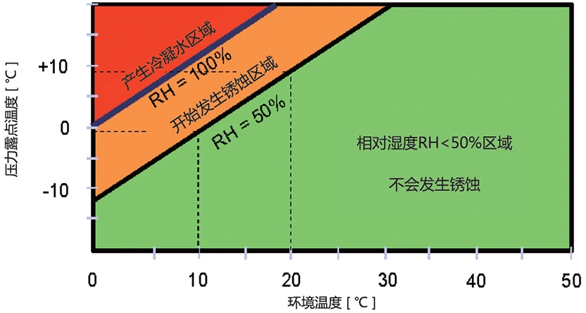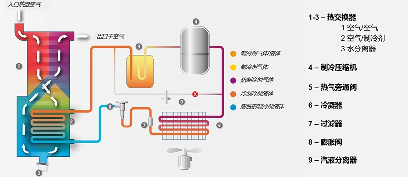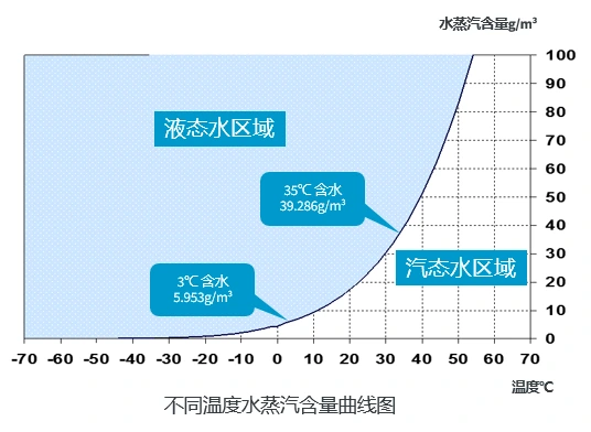 Paveikslėlyje parodyta, kad skirtingomis temperatūromis oras sulaiko skirtingus vandens garų kiekius. Oras atvėsta, o vandens garų lygis taip pat sumažėja. Kreivė turi taškų, žyminčių sočiųjų vandens garų lygį. Kiekvieno iš šių taškų temperatūra yra rasos taškas. Žemesnis rasos taškas reiškia mažiau vandens garų suslėgtame ore. Šią fizinę taisyklę naudoja šaldytuvo oro džiovintuvai. Jie leidžia suslėgtam orui pakeisti šilumą su šaltnešiu. Šis veiksmas sumažina suspausto oro temperatūrą. Atvėsusio oro vandens garai virsta skystu vandeniu. Šis skystis išleidžiamas iš sistemos. Pavyzdžiui, 35 ℃ suslėgtame ore sočiųjų vandens garų kiekis yra 39,286 g/m³. Pasikeitus šilumai su šaltnešiu ir atvėsus iki 3 ℃, sočiųjų vandens garų kiekis yra 5,953 g /m³. Skirtumas 33,333 g /m³ rodo vandens kiekį, pašalintą po aušinimo ir dehidratacijos šaldymo džiovintuvu. Tai reiškia, kad po to, kai suspaustas oras praeina per šaldymo džiovintuvą, pašalinama apie 85% drėgmės, užtikrinant, kad suspausto oro džiovinimas atitiktų gamybos proceso reikalavimus.