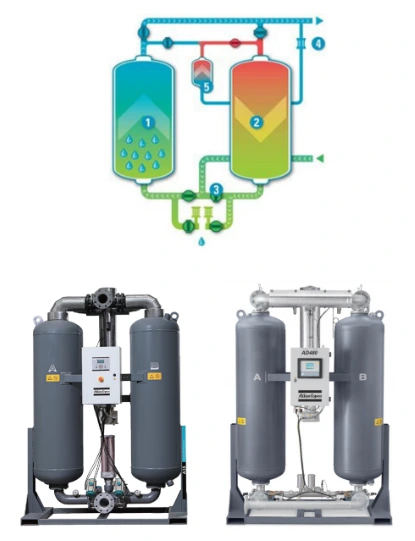Kol vienas bokštas veikia adsorbcijos režimu, kitas – regeneravimo režimu. Adsorbento regeneracijai sunaudojama elektrinio šildytuvo šiluma ir nedidelis gatavo suspausto oro kiekis.